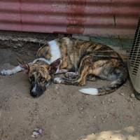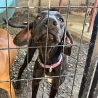 Approx. D.O.B. May 2021. Upon rescue we thought Cindy, had been hit by a car but that was not the case. She is a distemper survivor and needs treatment to calm shaking. She gets around great and loves to be around people and the other dogs in the outdoor shelter.